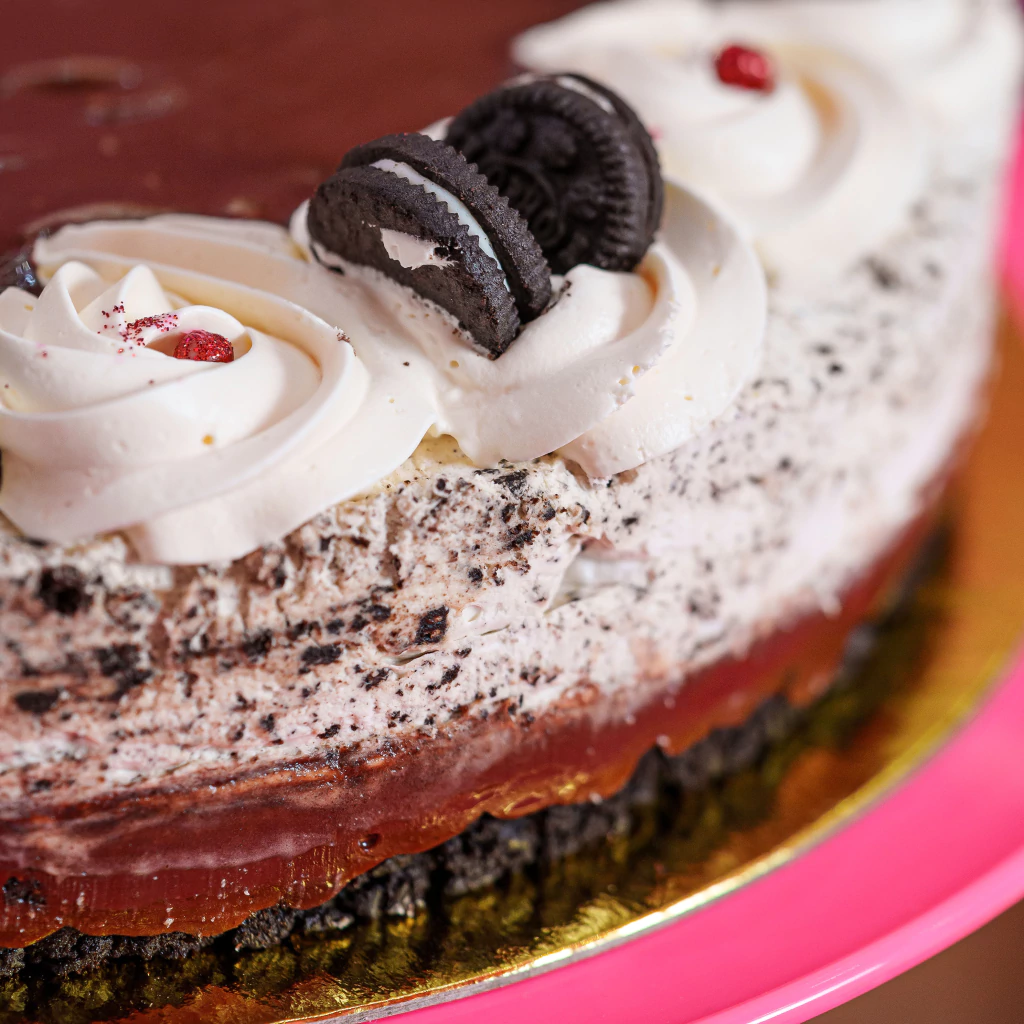 Base crocante de Negresco, com uma camada generosa de Nutella, creme ganache de chocolate branco com chantilly e Negresco que garante a crocância, finalizado com mousse de chocolate branco.