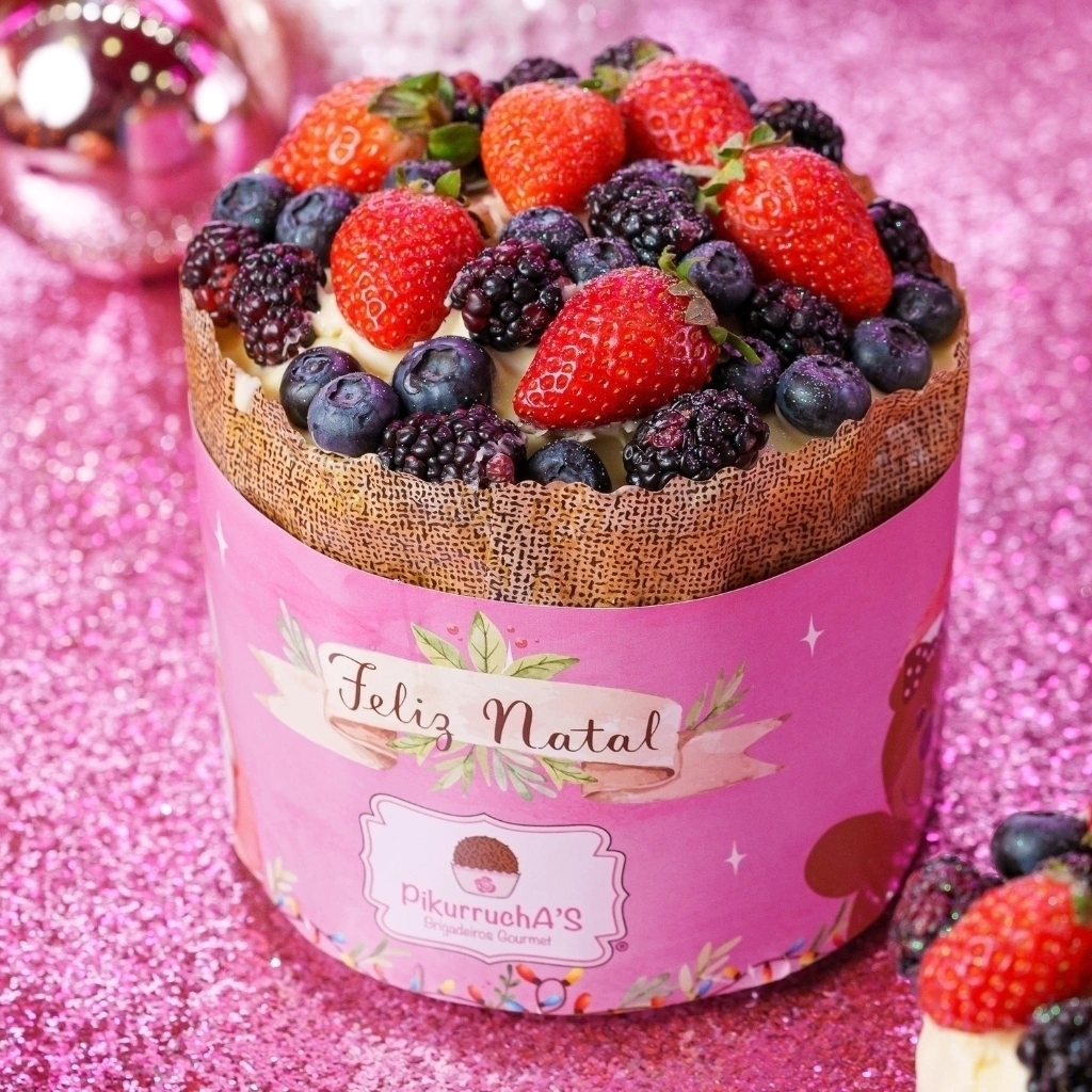 Contém um panetone ou chocotone de frutas vermelhas + uma embalagem natalina.