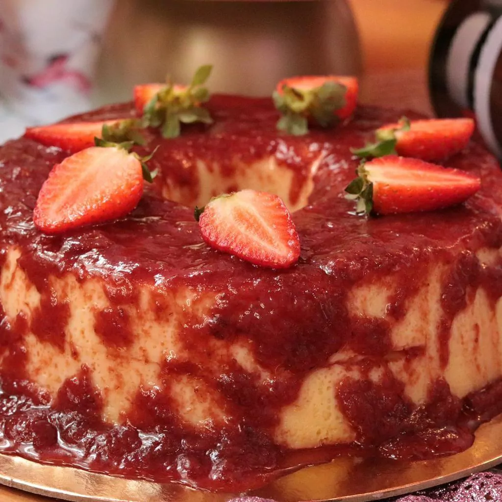 Pudim cremoso feito com leite ninho, coberto com geléia de morango caseira. Imperdível, tem gostinho de quero mais!